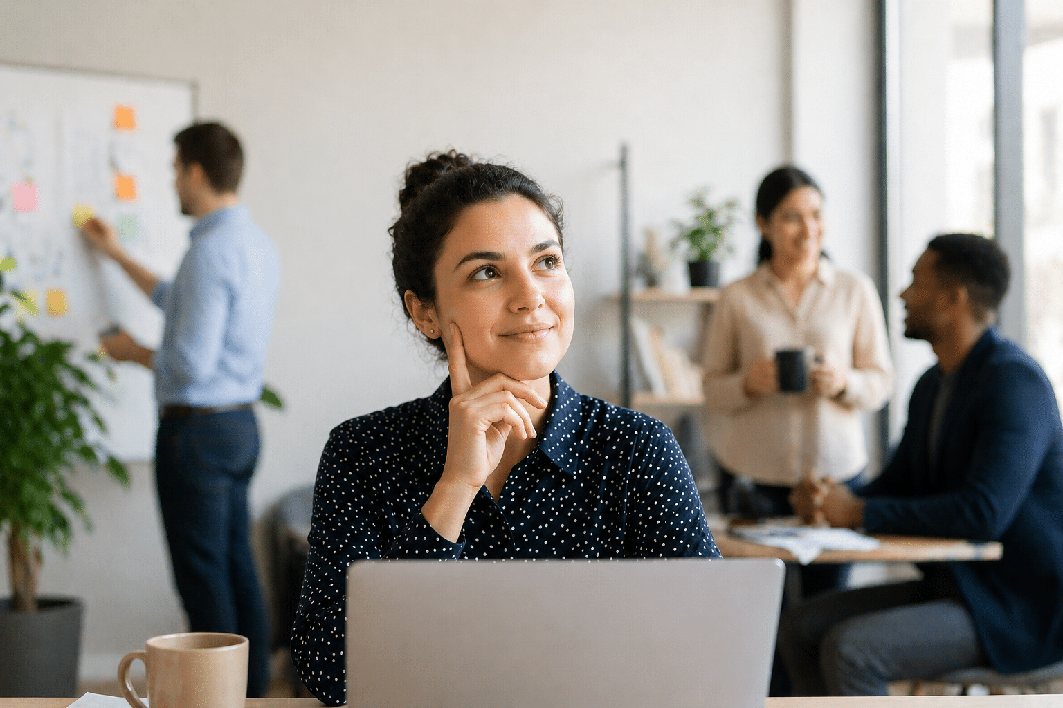 Femme d'affaire au premier plan avec une équipe au second plan pour illustrer le fait de préparer votre rentrée professionnelle HR Tips 28 August 2024 Tips for a successful return after the holidays + Read more